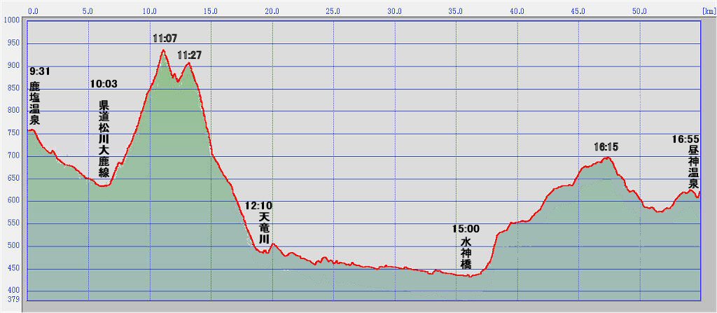 54.9 km 所要時間: 7 時間 51 分 30 秒 平均速度: 毎時 7.0 km |