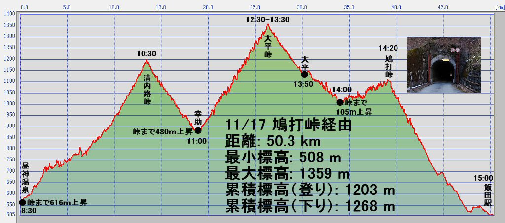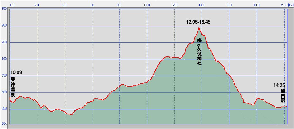 20.2 km 所要時間: 4 時間 16 分 38 秒 平均速度: 毎時 4.7 km |